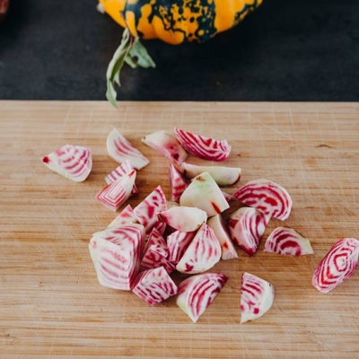 2Rübe schälen und würfeln, den Kürbis schälen, entkernen und in kleine Stücke schneiden.