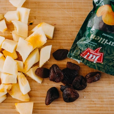 3Die Dörrmarillen ebenfalls in kleinere Stücke schneiden.