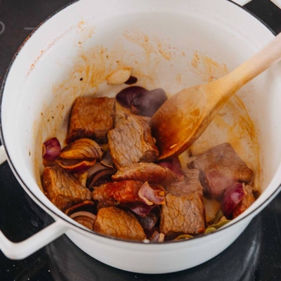 7Dann das Edelgulasch vom Bio-Weidejungrind zugeben und unter Rühren ca. 30 Minuten kochen, eventuell etwas Wasser zugeben.