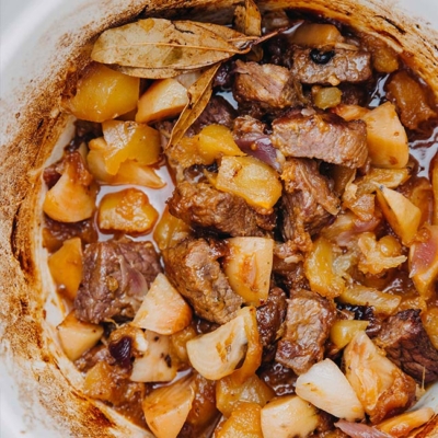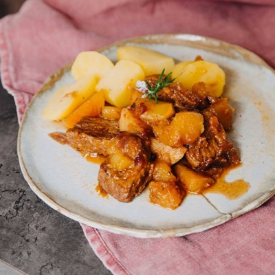 8Danach die Rübe, den gewürfelten Kürbis, die Marillen, etwas Paprikapulver und Salz zugeben und in einen geschlossenen Topf (ohne Plastikgriffe und Knäufe), eine Tajine oder einen Römertopf geben und im Backrohr bei 200°C ca. 60 Minuten fertig kochen bis das Fleisch weich ist.