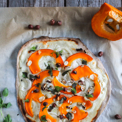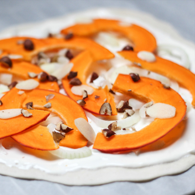 5Jeden Teigfladen dick mit Sauerrahm bestreichen, dann salzen und pfeffern. Nun erst die Zwiebelringe, dann die Kürbisspalten darauf verteilen. Schlussendlich mit den Haselnüssen und dem Knoblauch bestreuen.
