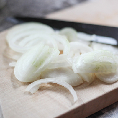 3Die Zwiebel in Ringe schneiden, die Knoblauchzehen schälen und mit der Küchenhobel in feinste Scheiben schneiden. Die Haselnüsse grob hacken.