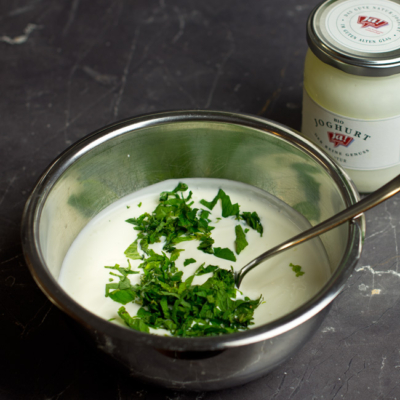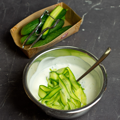 4Die Minzblätter in feine Streifen schneiden und mit dem Joghurt verrühren. Die Gurken entweder mit einem Messer oder einem Sparschäler längs in feine Streifen schneiden und ebenfalls mit dem Jogurt vermengen. Mit Salz und Pfeffer abschmecken.