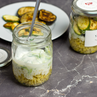 6Dann als erstes die Hirse, das Gurkenjoghurt und anschließend das Gemüse in das leere Joghurtglas oder ein anderes Gefäß schichten.