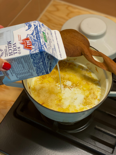 4Mit der Vollmilch ablöschen, den Zucker hinzugeben und zum Kochen bringen. Immer stetig umrühren, sonst geht die Milch schnell über.