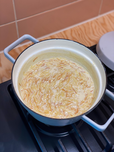 3Nun zu den Milchnudeln. In einem kleinen Topf die Butter hineingeben und bei mittlerer Hitze langsam schmelzen lassen. Die Fadennudeln hinzugeben und für etwa 5 Minuten darin goldbraun anbraten.