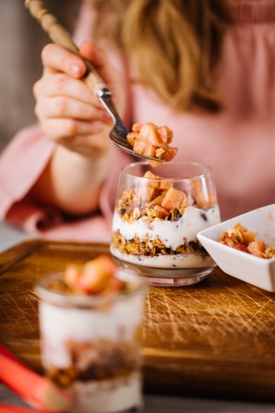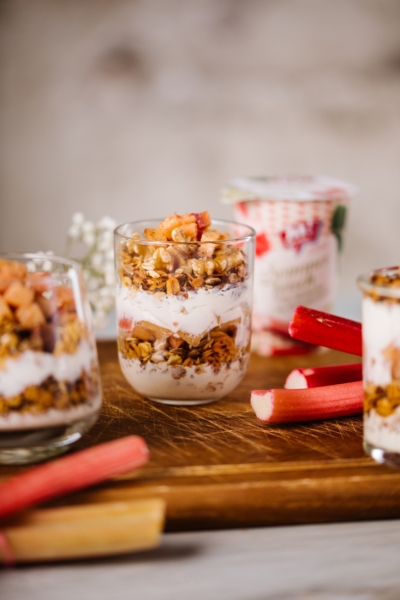 4Abwechselnd Joghurt, Rhabarber und Granola in die Dessergläser geben und am Schluss mit Knusper-Topping und Zimt bestäuben.