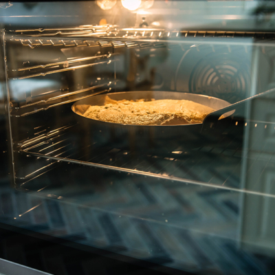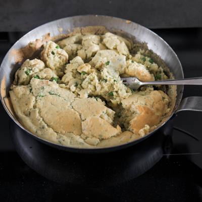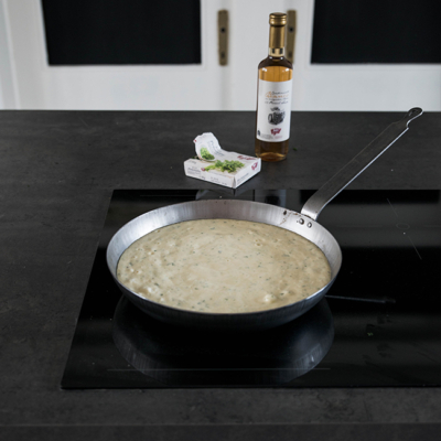4Einen Esslöffel Butterschmalz in einer Pfanne erhitzen und den Teig eingießen. Bei mittlerer Hitze 3 – 4 Minuten auf dem Herd backen. Danach 12 Minuten in den heißen Ofen geben (Achtung! Keine Pfanne mit Plastik-Griffen verwenden).