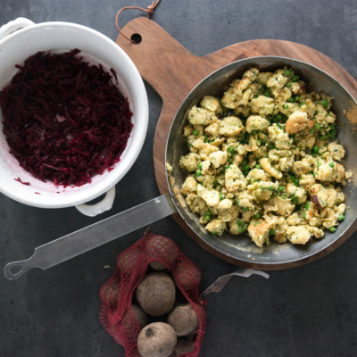 6Schmarren mit 2 Gabeln in kleinere Stücke zupfen, einen Löffel Butterschmalz in die Pfanne geben, den restlichen Bergkäse hinzugeben und die Schmarren-Stücke kurz anbraten. Mit dem rote Rüben Salat servieren.