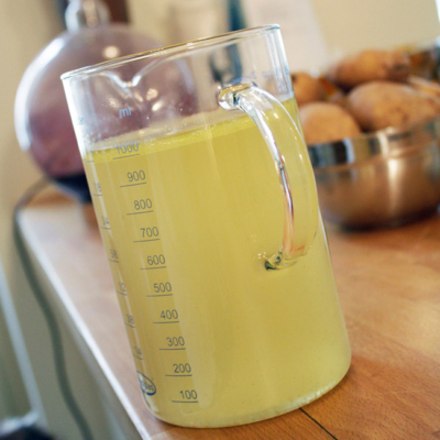7Vor Servieren den Jus aus dem Kühlschrank nehmen, das abgesetzte Fett entfernen und in einem Topf erhitzen. Jus mit etwas Butter montieren, würzen mit Salz und Pfeffer und Condimento Bianco. Den Jus auf kleiner Flamme für 10 Minuten köcheln lassen.