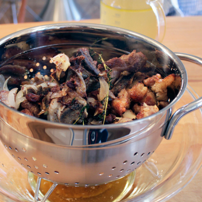 4Den gesamten Topfinhalt in ein grobes Sieb geben, das tropfende Fett auffangen. Ein Drittel des abgetropften Fetts zusammen mit dem restlichen Topfinhalt in den Topf zurückgeben, mit Weißwein ablöschen und umrühren bis der gesamte Wein verdunstet ist.