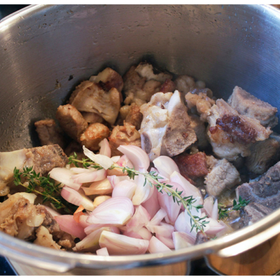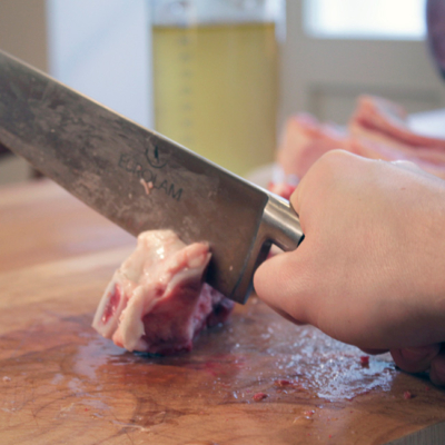1Das Fleisch in 4 cm große Stücke schneiden. Die Knochen mit einem Fleischerbeil oder dem hinteren Ende des Messers zerhacken (siehe Foto).