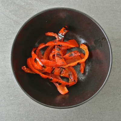 2Die Spitzpaprika schneide ich in ca. 5 mm schmale Längsstreifen und mariniere sie in etwas Olivenöl. Um sie zu garen, verwende ich meine Grillpfanne, damit sie das schöne Streifenmuster bekommen. Danach mariniere ich sie noch in etwas Olivenöl und Zitronensaft. Darauf werde ich später meine Fleischbällchen anrichten, sie bringen neben angenehmer Süße auch mehr Farbe in dieses Gericht.