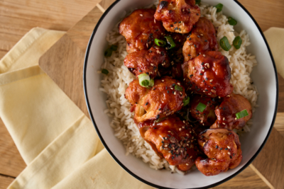 6Die Bio-Karfiol Wings mit Reis oder einer anderen Beilage servieren und nach Belieben mit weiteren Dips genießen.