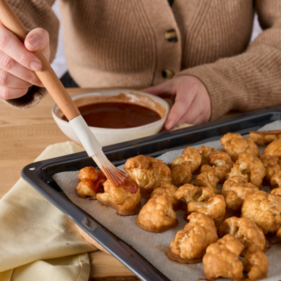 5Die fertigen Bio-Karfiol Wings mit BBQ Sauce bestreichen. Danach die Wings zurück in den Ofen schieben und für weitere 20 Minuten backen.