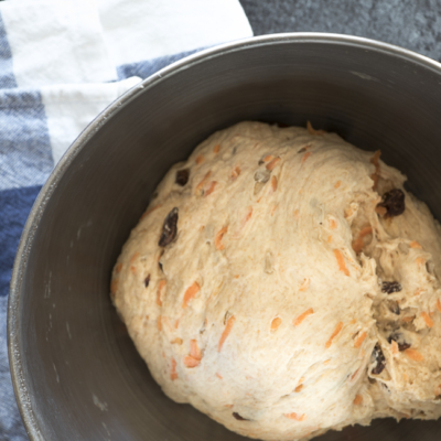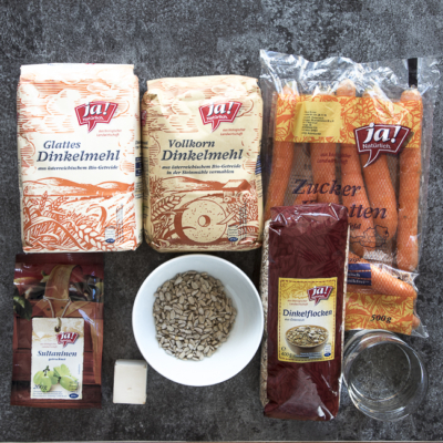 Ich erinnere mich noch ganz genau an das Erntedankfest in der 1. Volksschulklasse. Wir haben alle Obst und Gemüse der Saison mitgebracht. Schon damals habe ich mich für Karotten entschieden. Karotten kombiniert mit Rosinen verleiht dem Brot meiner Meinung nach einen wunderbar herbstlichen Geschmack. Wer keine Rosinen mag kann sie durch Cranberries ersetzten.