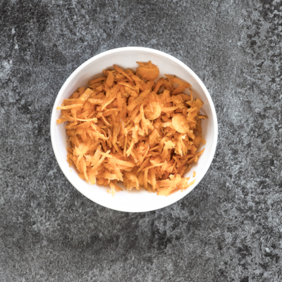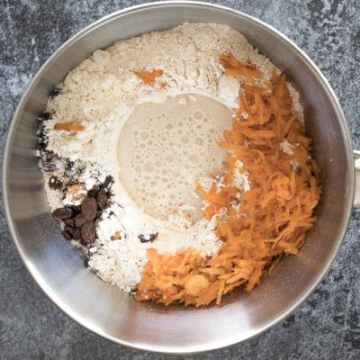 1Karotten waschen und fein hobeln und zu den trockenen Zutaten hinzufügen.