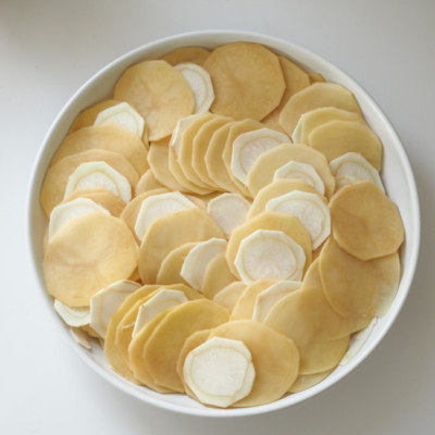 1Die Erdäpfel und Peterwurzen waschen, schälen und mit einem Küchenhobel in feine Scheiben schneiden. Die aromatischen Schalen der Peterwurzen dabei unbedingt aufheben und z.B. zu einer klaren Gemüsesuppe weiterverarbeiten.