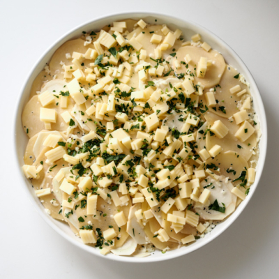 4Den Käse hacken und mit den restlichen Butterflocken über das Gratin streuen.