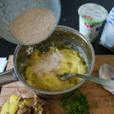 9Die heiße Milch nach und nach unter den Kartoffelporridge rühren. Je nach Kartoffelsorte und Menge der Dinkelflocken, benötigt man mehr oder weniger Milch. Den Brei mit Salz, Pfeffer und Muskat abschmecken.