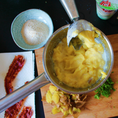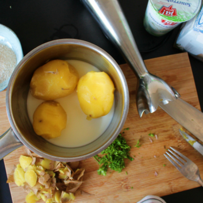 5Während die Zwiebeln in der Pfanne sind, die weichen Kartoffeln schälen und mit dem Stabmixer pürieren.