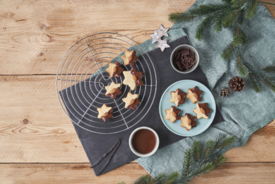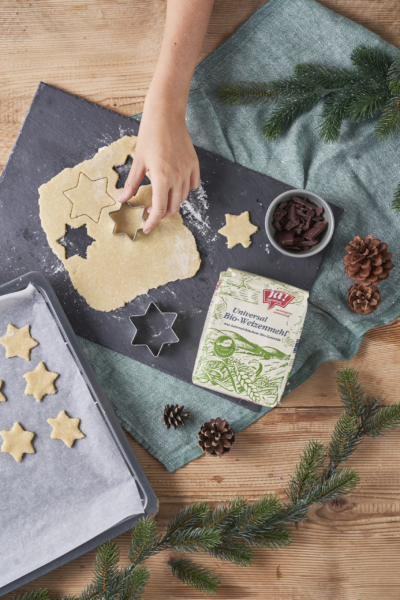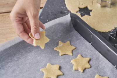 3Den Teig auf ca. 2 mm Stärke ausrollen und mit einer beliebigen Form ausstechen, aufs Blech legen und im Rohr für ca. 10 Minuten backen.