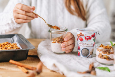 Kirsche-Mohn-Zimt-Joghurt-Mousse mit Hirse-Hafer-Crumble