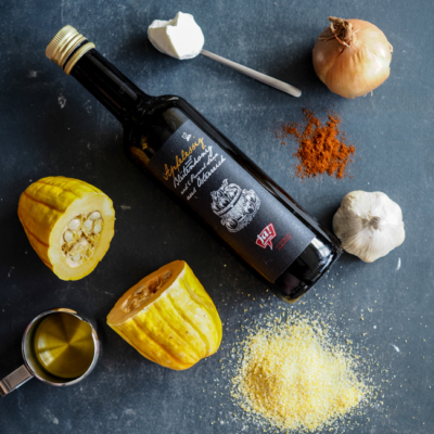 32 EL Olivenöl in einem Topf heiß werden lassen, dann Zwiebel und Knoblauch darin anschwitzen. Paprikapulver und Kümmel hinzufügen und kurz mitrösten, dann mit dem Essig aufgießen. Etwas einkochen lassen, dann den Kürbis hinzufügen. Mit Wasser aufgießen, bis der Kürbis knapp bedeckt ist, dann etwa 20 Minuten auf kleiner Flamme köcheln lassen.