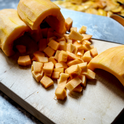 2Zwiebel und Knoblauch schälen und hacken, den Kürbis schälen und würfeln.