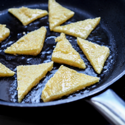 4In der Zwischenzeit die festgewordene Polenta in Ecken schneiden und Öl in einer Pfanne heiß werden lassen. Darin die Polenta-Ecken auf beiden Seiten knusprig braten.