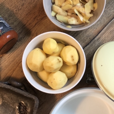 1Einen Topf mit Wasser aufstellen und zum Kochen bringen. Erdäpfel schneiden, schälen und halbieren. Weich kochen.