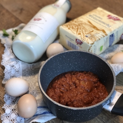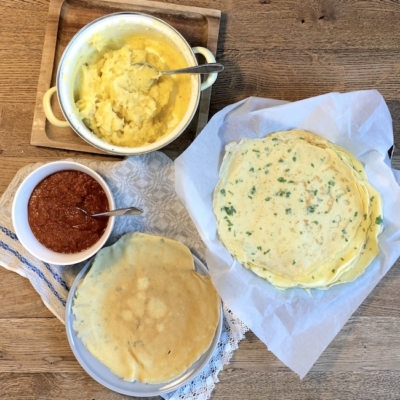 6Palatschinken mit Püree und Sugo füllen und zum Wrap formen.