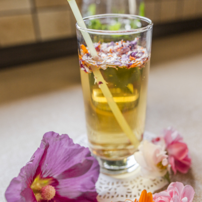 Wird das Getränk zur heißen Jahreszeit noch mit selbst hergestellten Blüteneiswürfel gekühlt, ist es ein richtiger Hingucker auf jeder Sommerparty. Dazu einfach verschiedene Blüten (Ringelblume, Borretsch, Malven,..) in eine Eiswürfelform legen, mit Wasser auffüllen und einfrieren.