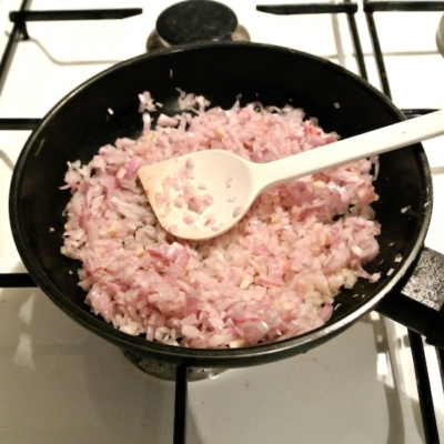 2Schalotten sehr fein würfeln und in einer Pfanne mit 2 EL Olivenöl kurz glasig anschwitzen, sie sollen nicht braun werden.