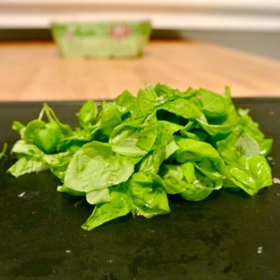 4Basilikum waschen, trocknen und ein wenig zerrupfen, NICHT fein hacken.