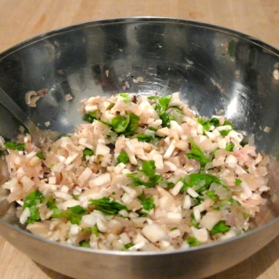 1Kräuterseitlinge fein würfeln – da der Pilz nicht aus dem Wald kommt (und bio ist), muss man ihn weder waschen noch putzen!