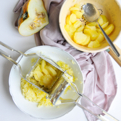 1Kartoffel und Kürbis schälen und in Würfel schneiden ,
