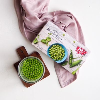 7Erbsen zum schnellen Antauen mit heißem Wasser übergießen.