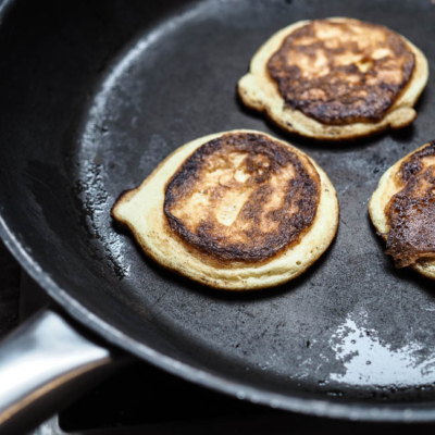 4Das Pflanzenöl in einer Pfanne erhitzen und den Pancake-Teig portionsweise ins heiße Fett gleiten lassen. Wenden und auf der anderen Seite fertigbacken.
