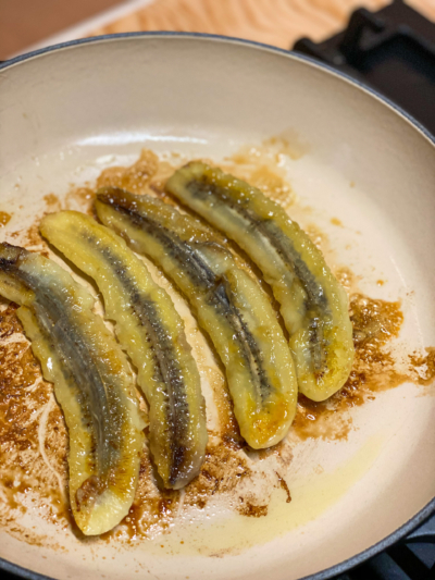 2Bananen von der Schale entfernen und länglich halbieren. In einer Pfanne Olivenöl und Agavendicksaft erhitzen und die Bananen darin anbraten bis sie schön karamellisiert sind.