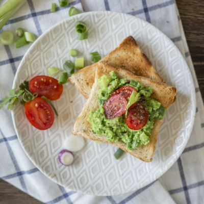 6Erbsenhummus darauf anrichten, mit aufgeschnittenen Kirschtomaten, Koriander oder Sprossen dekorieren.