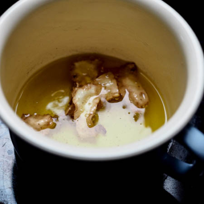 21 EL Öl in einem Topf heiß werden lassen, dann erst die Zwiebel und den Knoblauch anschwitzen, anschließend mit der Gemüsebrühe aufgießen. Kartoffeln, Maroni und Sellerie zugeben und etwa 20 Minuten köcheln lassen.