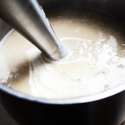 4Nun die Suppe mit einem Stabmixer pürieren, den Schlagobers zugeben und noch einmal aufschäumen. Mit Zimt, Salz und Pfeffer abschmecken und mit Selleriechips sowie gehackter Petersilie servieren.