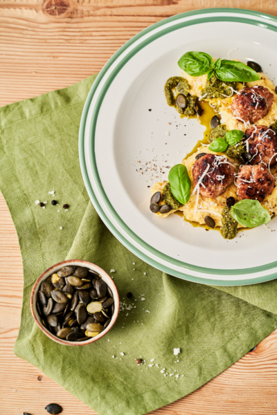 Meatballs vom Weidejungrind & Strohschwein auf cremiger Polenta & Pesto