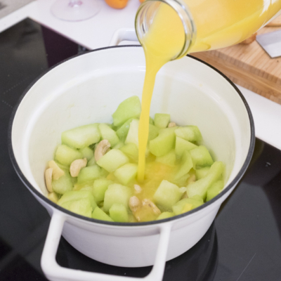 3Den gehackten Ingwer, die gehackte Chilischote und die Nüsse dazu geben und mit dem Orangensaft ablöschen. Die 6 Melonenkugeln aufsparen! Nun 5 Minuten köcheln lassen.