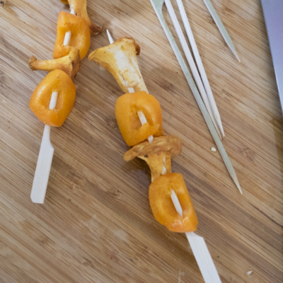 6Als Topping aus kleinen (!) Eierschwammerln(geputzt und halbiert) und den Marillen (gewaschen, entkernt und geviertelt) für jede Portion je einen kleinen Spieß machen, indem abwechselnd ein Eierschwammerl und ein Marillenstück aufgesteckt werden.