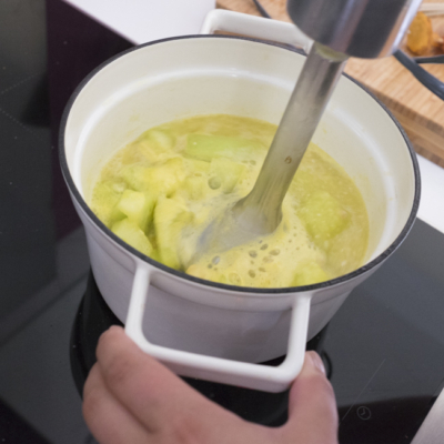 2In einer hohen Pfanne oder einem Topf das Olivenöl erhitzen und die grob geschnittene Melone darin kurz anbraten.