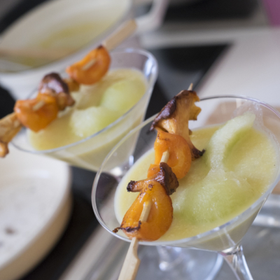 Der Sommer glüht in höchsten Temperaturen und wir lechzen nach Abkühlung! Die Lösung: Eine fruchtige Melonenkaltschale mit ungewöhnlicher Begleitung – einem süßpikantem Topping aus gebratenen Marillen und Eierschwammerln. Ein köstlicher Mix, der die eiskalte Fruchtsuppe ideal abrundet. Wer keine Marillen findet, kann auch Pfirsiche oder Nektarinen verwenden.