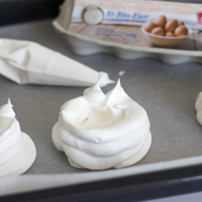 2Den Backofen auf 180 Grad vorheizen und ein Backblech mit Backpapier auslegen. Die Baiser-Masse in einen Spritzsack mit runder Tülle füllen und auf dem Backblech erst 6 Kreise mit etwa 10 cm Durchmesser aufspritzen und diese dann kreisförmig mit einem Rand versehen. Das Ziel ist, dass kleine Baiser-Schüsselchen entstehen. Wer keinen Spritzsack verwenden möchte, kann die Pavlovas auch schlicht mit einem Löffel formen.