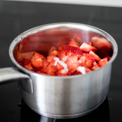 4In der Zwischenzeit 100 g Erdbeeren waschen, putzen und mit dem Zucker in einem Kochtopf auf den Herd stellen. Ein paar Minuten köcheln lassen, bis die Erdbeeren beginnen zu zerfallen, dann mit einem Stabmixer pürieren.